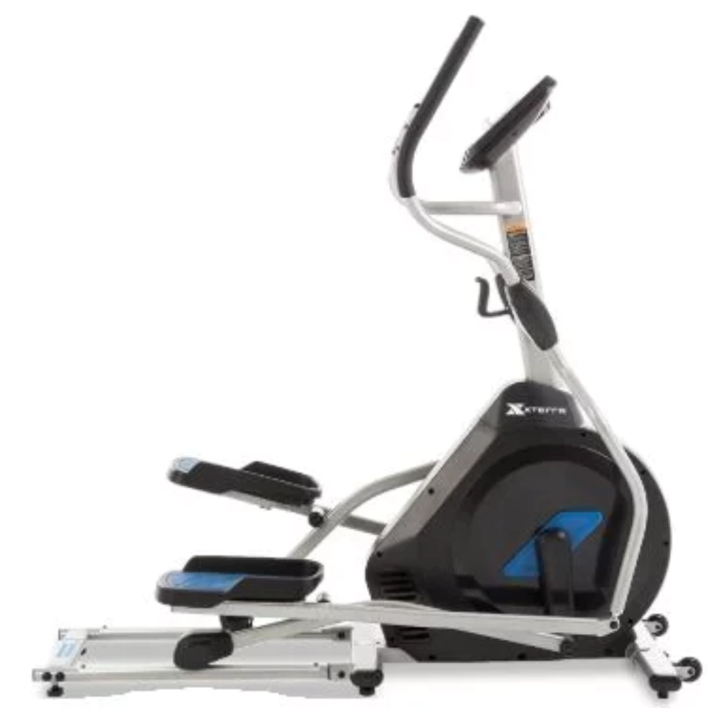 Elíptica magnética marca XTERRA FS380, Monitor LCD con retroalimentación azul. Pedales sobredimensionados con esparcimiento Q- FACTOR 5.1 cm con declinación interna de 2° que ofrecen una optima posición del cuerpo para lograr un entrenamiento corporal suave y sin impacto. Altavoces incorporados con entrada de audio/ MP3, Ruedas de transporte para fácil desplazamiento.