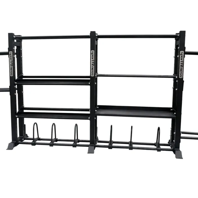 Capacidad de almacenamiento: 10 porta discos, 2 soportes de mancuernas, 1 soporte plano para accesorios, 3 soportes de balones, 6 separadores de discos, 3 soportes de barras.