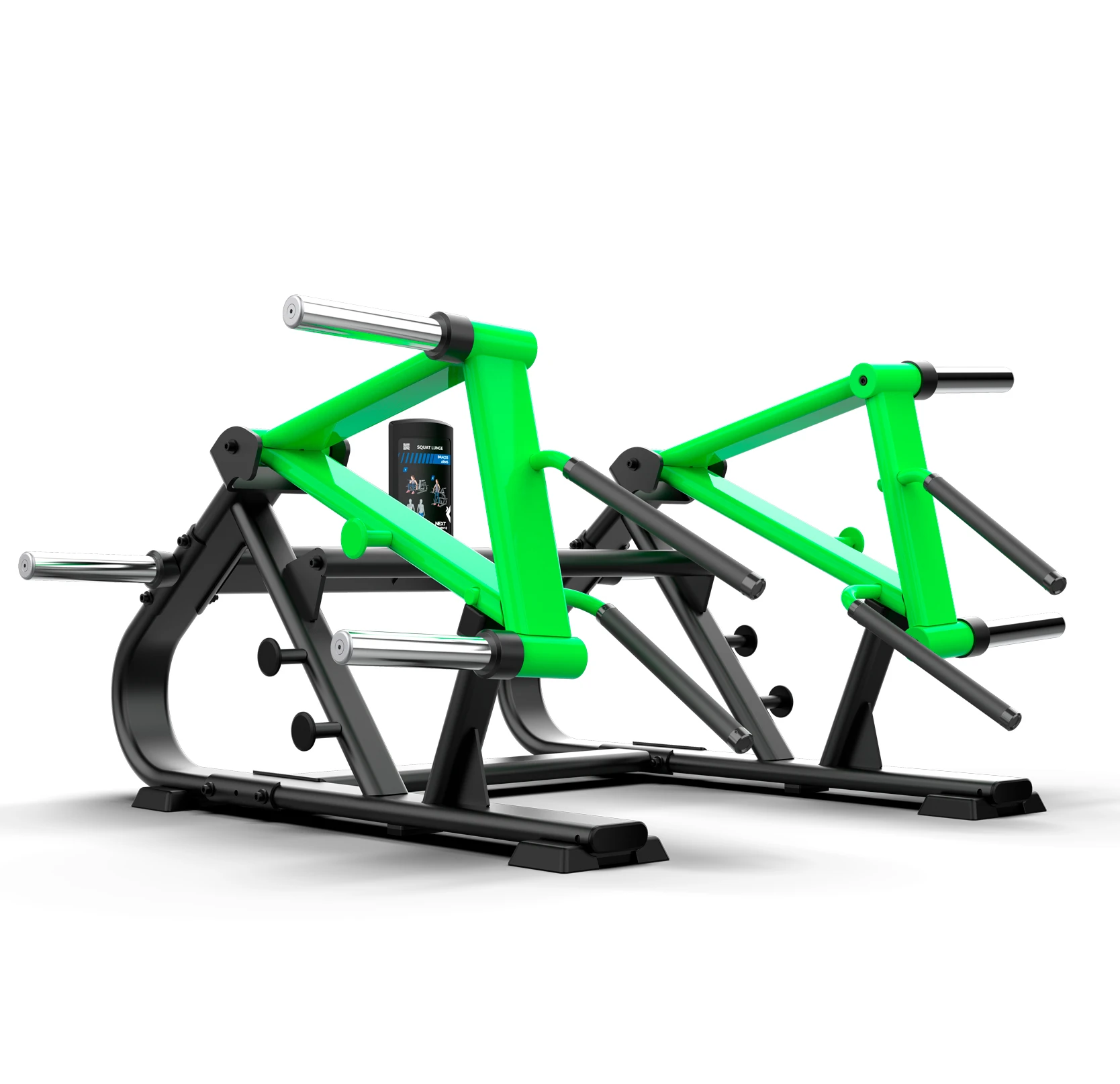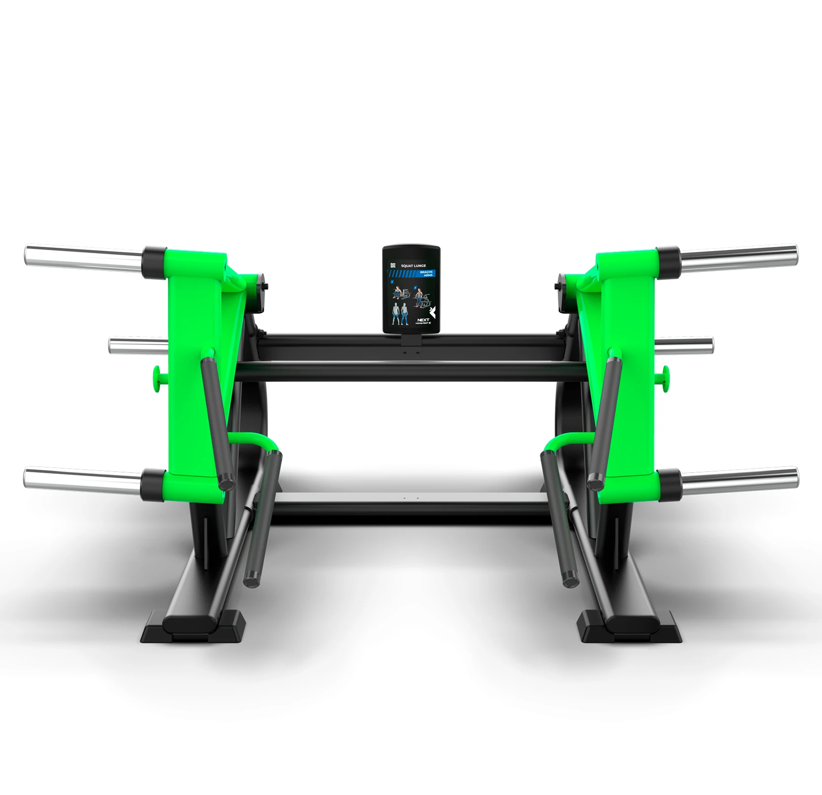 Disponible en verde, amarillo, rojo, morado y negro, este equipo se integra a la perfección con la estética de tu gimnasio. Su disco de pesas de acero inoxidable tiene una capacidad de 200 kg, con 100 kg por brazo, lo que garantiza un entrenamiento intenso. La estructura del Squat Lunge está compuesta por grandes tubos redondeados (115 x 40 mm), lo que le confiere robustez y lo convierte en una opción fiable para gimnasios que valoran la calidad y el rendimiento.