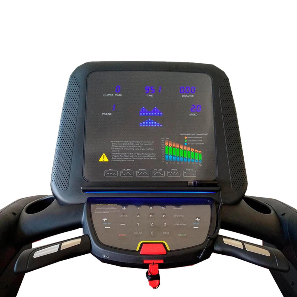 Incluye conectividad MP3 con parlantes, alerta de necesidad de lubricación externa, 13 programas preestablecidos, superficie amortiguada para una excelente absorción de impactos que proporciona un empuje adecuado para reducir la posibilidad de cualquier tipo de lesión en rodillas y articulaciones. Banda ortopédica confiable para trabajo pesado de 2.2 cm de espesor. Consola de diseño lujoso a prueba de humedad con 6 ventanas tipo LED que indican: tiempo, velocidad, distancia, inclinación, calorías, frecuencia cardiaca y perfil de programa. Doble soporte para botellas de líquidos o accesorios